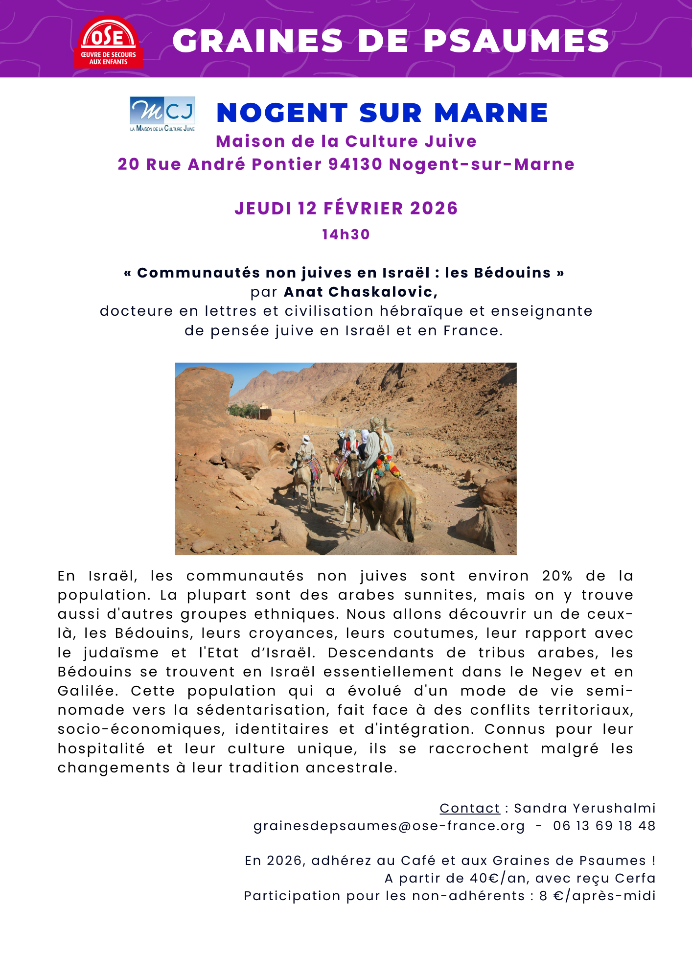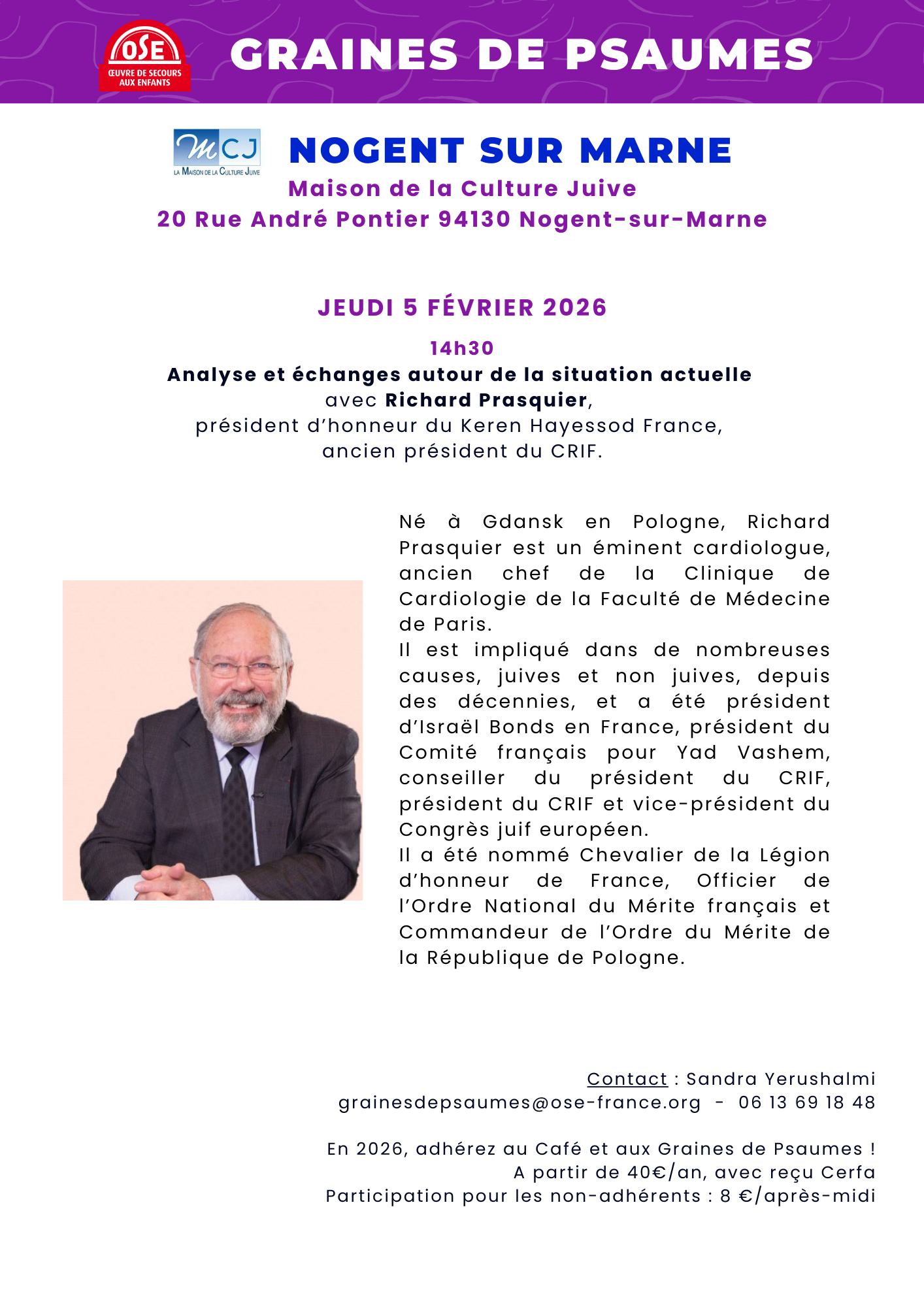 Maison de la Culture Juive – 20 rue André Pontier, 94130 Nogent-sur-Marne Janvier – Février 2026 Jeudi 8 janvier Jeudi 15 janvier Jeudi 22 janvier Jeudi 29 janvier 15h Concert du Duo Kerida –...