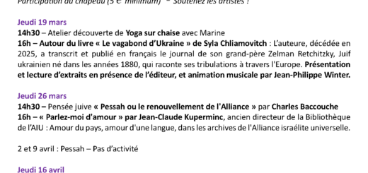 PAF 20 euros – Réservation impérative auprès de Suzanne 06 16 12 04 78 – RDV le 27/3 à 12h45 au 42 Avenue des Gobelins 75013 Paris