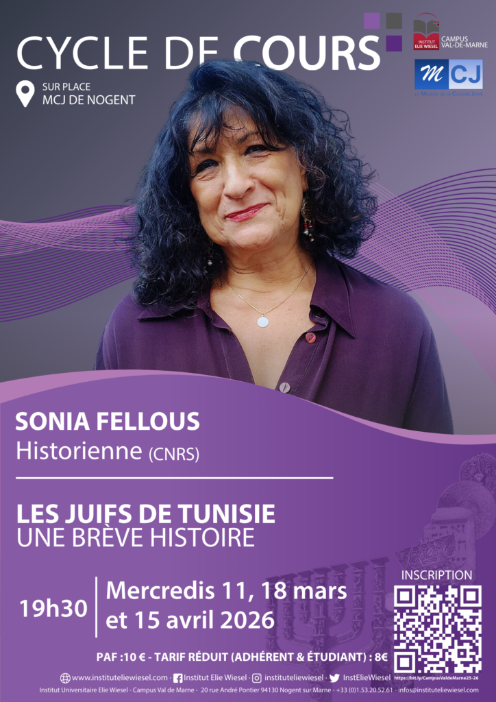 À propos de l’intervenante : Sonia Fellous est historienne, spécialiste de l’histoire et des cultures juives du monde méditerranéen, et particulièrement de la Tunisie. Ses travaux portent sur la mémoire, le patrimoine et les trajectoires diasporiques des Juifs d’Afrique du Nord.
