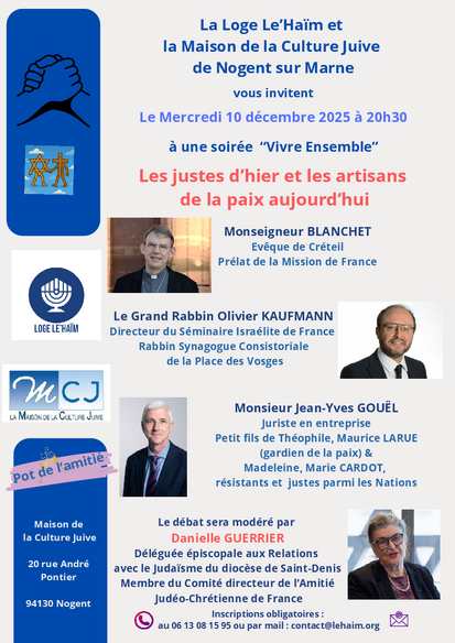 Les Rencontres « Vivre Ensemble » MCJ & Lehaïm Inscription obligatoire : 06 13 08 15 95 ou contact@lehaim.org Lieu : Maison de la Culture Juive – 20 Rue André Pontier 94130 Nogent sur Marne